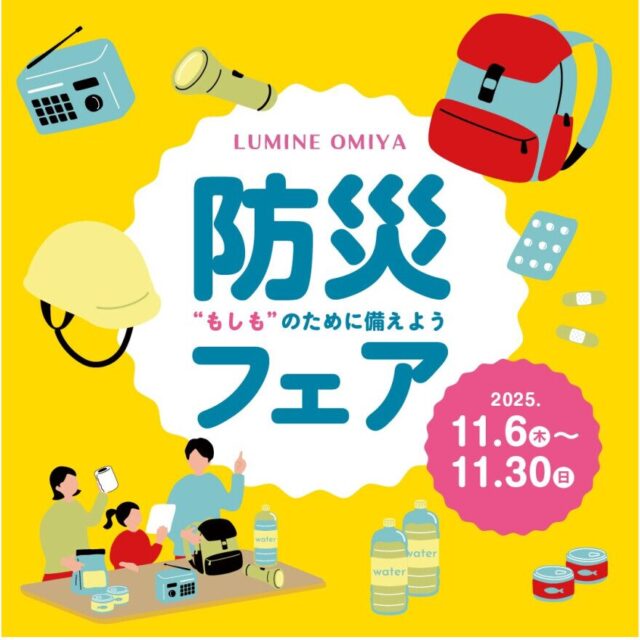 ルミネ大宮で開催される「LUMINE OMIYA 防災フェア」は、“もしも”のために備えるをテーマにした体験型イベントです。館内ショップによる防災グッズの販売や、防災意識を高める展示、さらに屋上庭園では消防士との記念撮影や消火体験など、親子で楽しみながら学べるプログラムが満載。身近な防災を体感できる貴重な機会です。