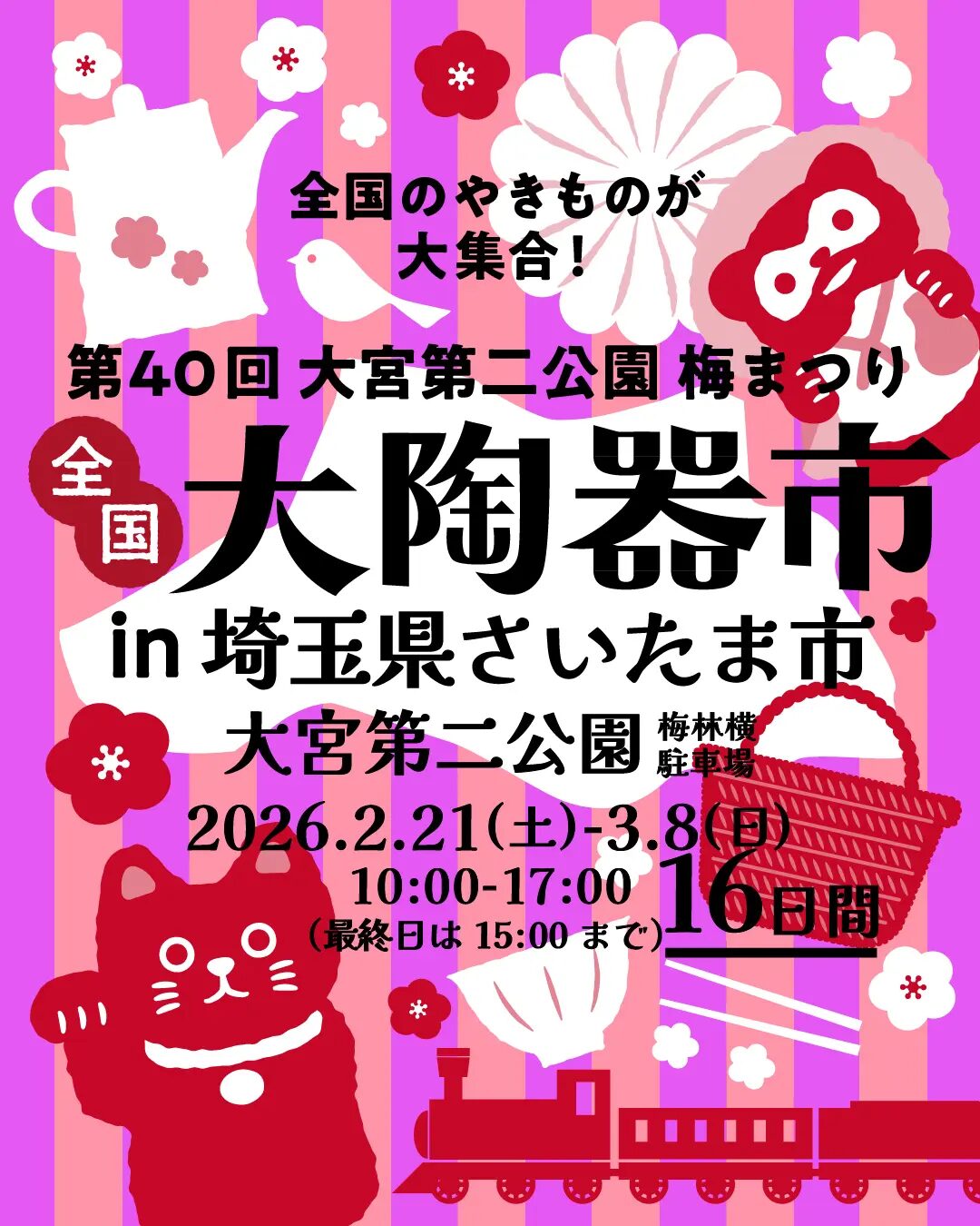 梅の香りがふわりと広がる季節、大宮第二公園に全国のやきものと民芸品が集う恒例イベント。梅林の風景に包まれながら、有田焼や美濃焼、益子焼など各地の器や、木製品・漆器・民芸雑貨、郷土菓子まで幅広い出店が並びます。散策気分で立ち寄れる開放的な会場は、器好きはもちろん、春先のおでかけ先としても注目の梅まつりです。
